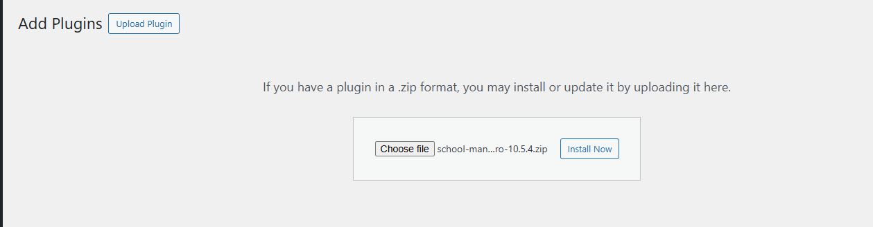 4. Click Choose File, locate the plugin .zip file, then click Install Now.